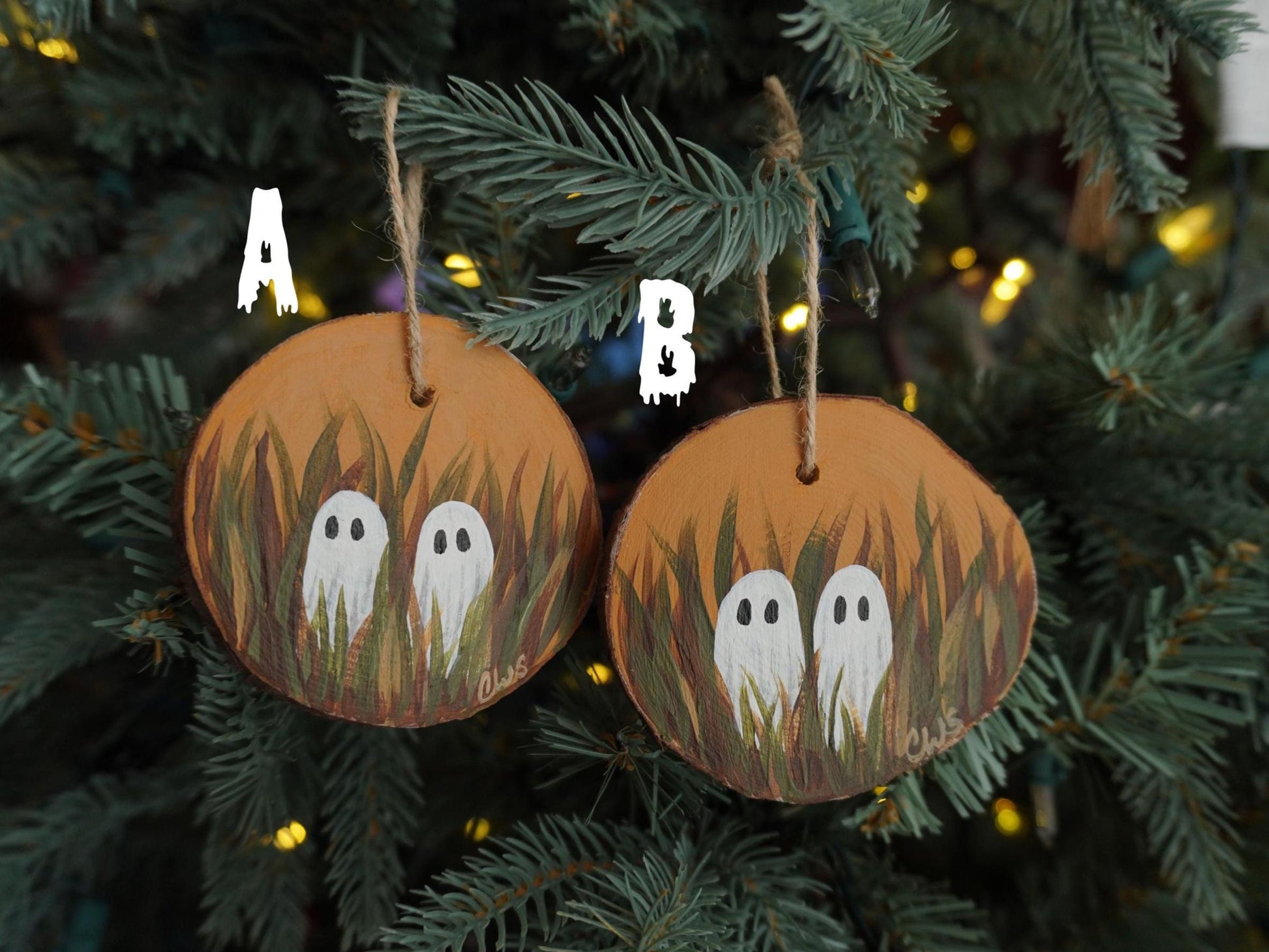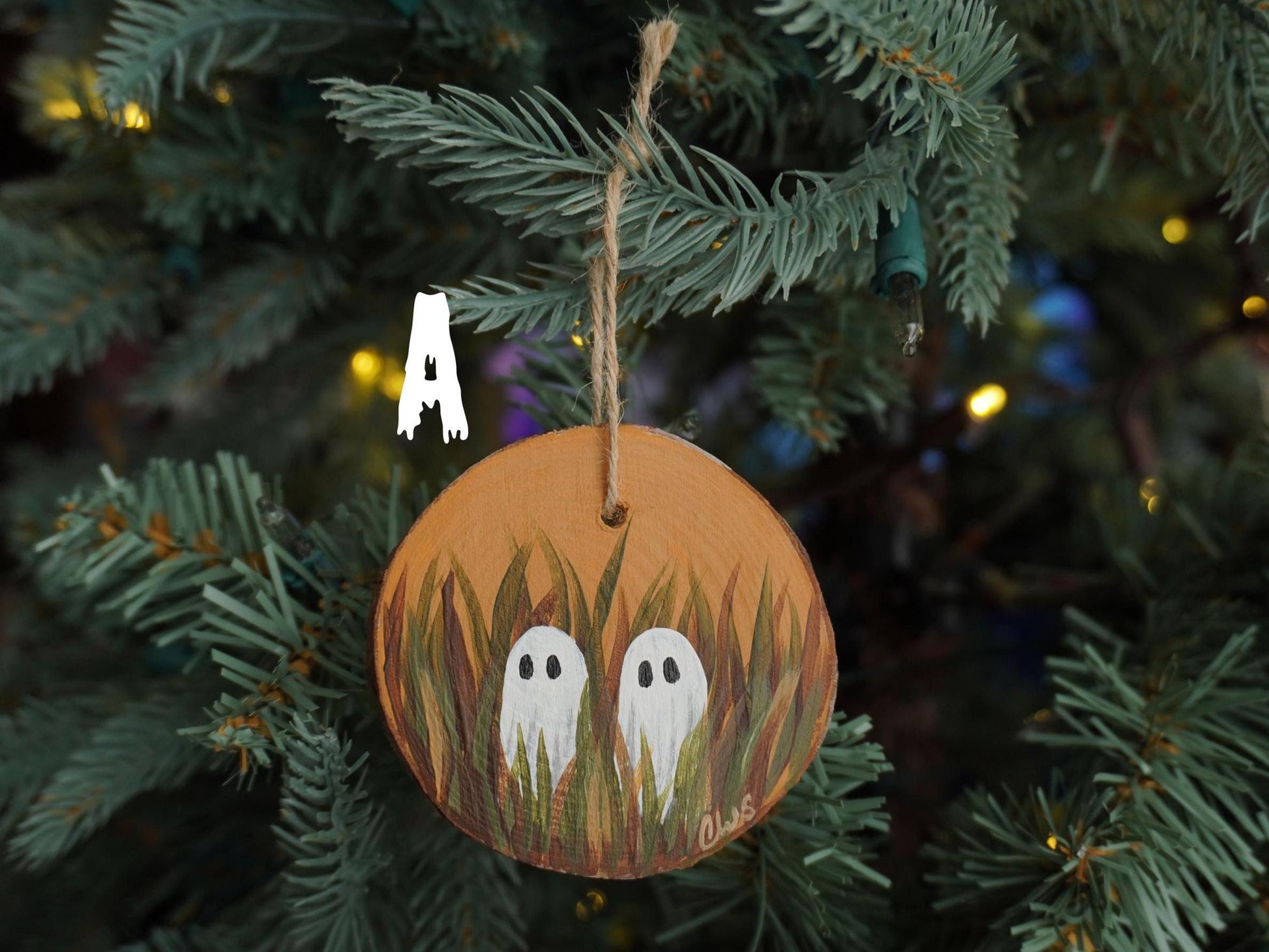 Ghosts in a Field Hand Painted Wood Ornament, Holiday Decor, Witch Art